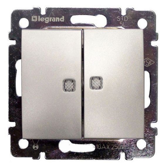 Выключатель 2-клавишный Legrand VALENA CLASSIC, с подсветкой, скрытый монтаж, алюминий, 770213